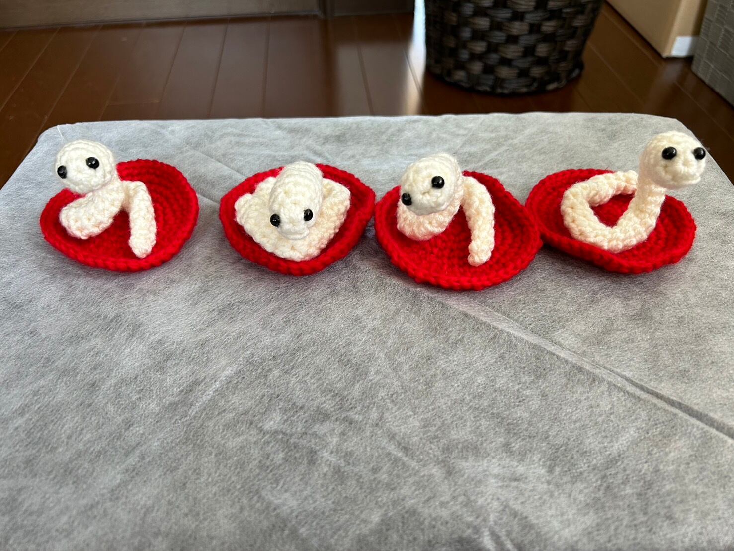 震災後、会社は休業し家で得意の毛糸を使って作品作りをしています。